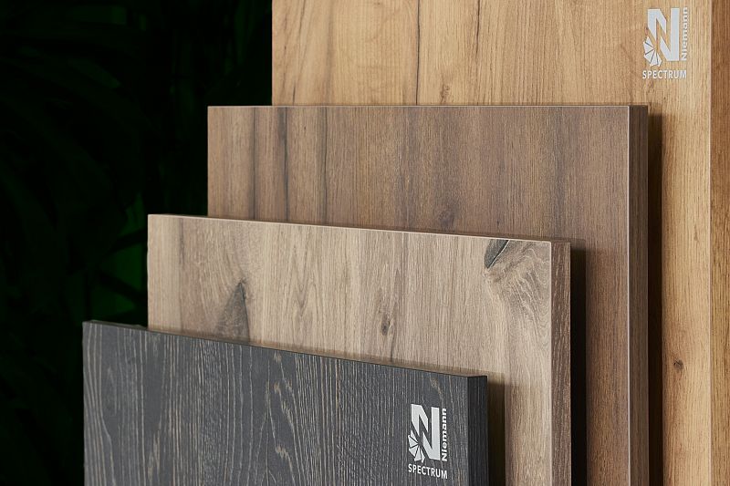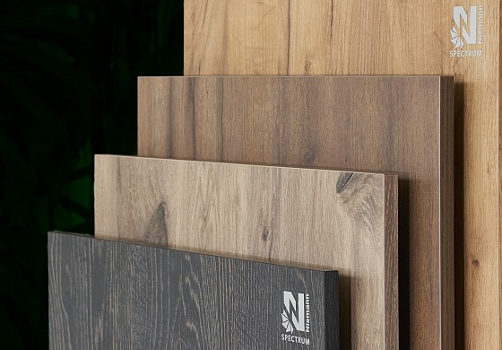 Melamine MDF or chipboard laminated with a 75μ thick transparent PET in film in matte. Measured reflectivity of <15 gloss units. As opposed to conventional matte boards available on the market, the surface has a characteristic satin touch and feel. It is resistant against scratching and fingerprints, and proves to be an excellent material for any interior design project.
